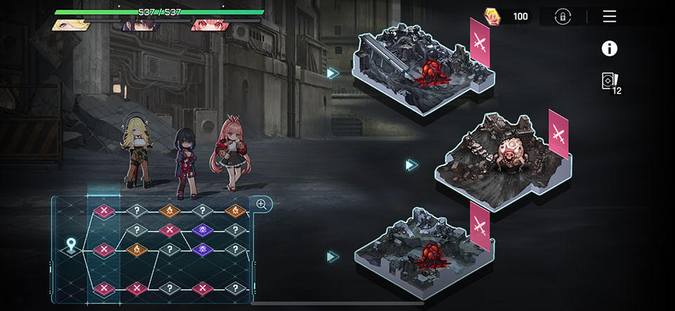 Slay the Spireと同じような構成で、いくつかのイベントがあるルートを任意で選択し、最終的にはボスのいるセクションまで進みます。