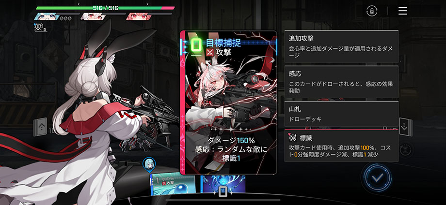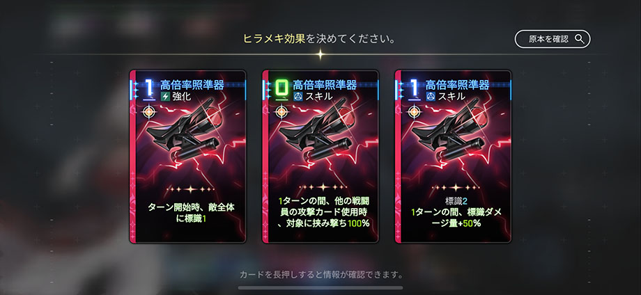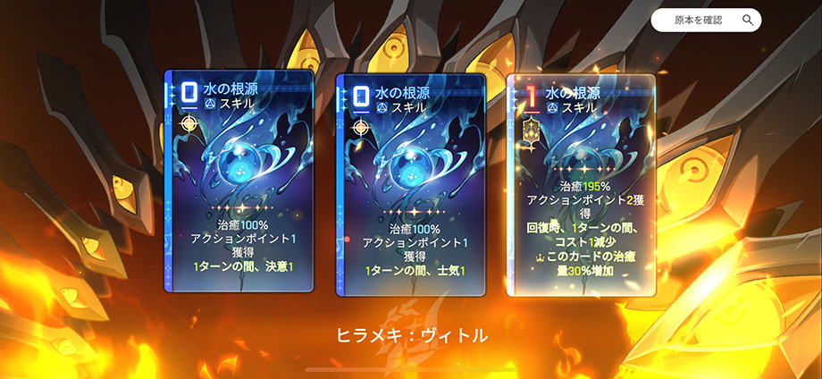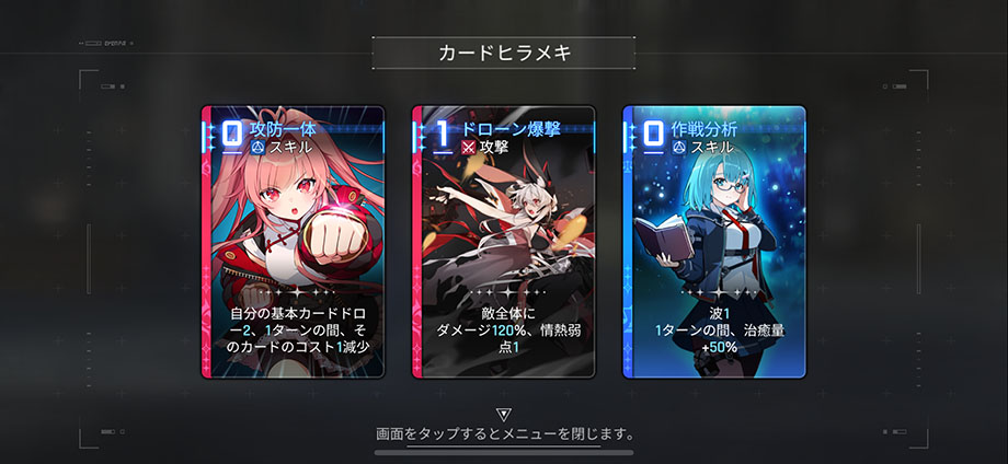 戦闘中はランダムでヒラメキが発生し、固有カードの入手/所持カードの進化が発生します。