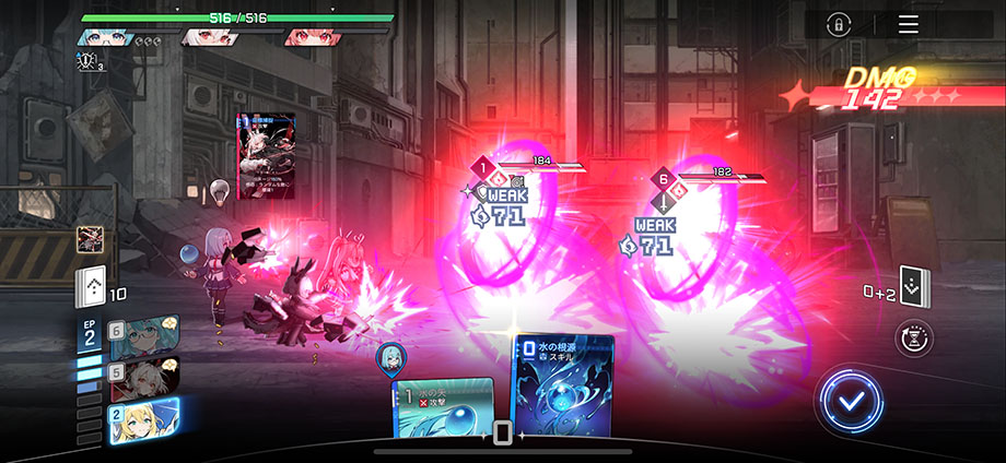 ミカはアクションポイント稼ぎ要因なので、彼女に過労死してもらってメイリンとセレーナが弱点攻撃を連打するのが、今回のデッキのコンセプトです。