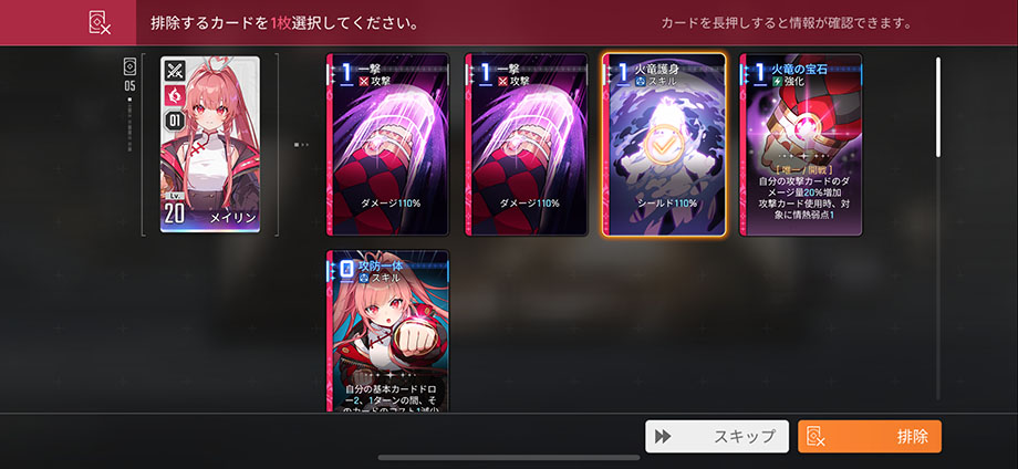 アタッカーにシールド貼らせる意味もない(というほど優位に防御力に差は無いけど)し、ここで「火竜護身」を削除しておくと、「攻防一体」で攻撃カード「一撃」を確定で引っ張ってくることが出来るようになります。