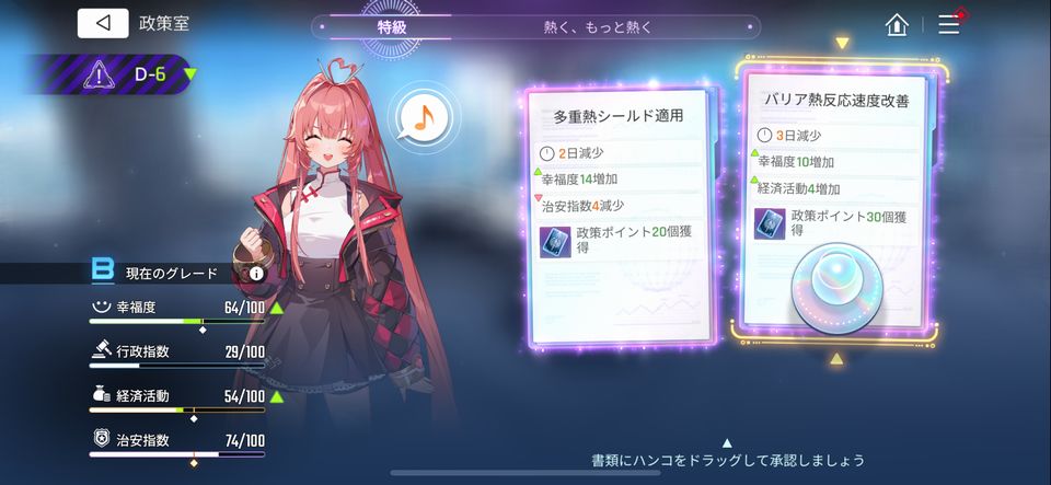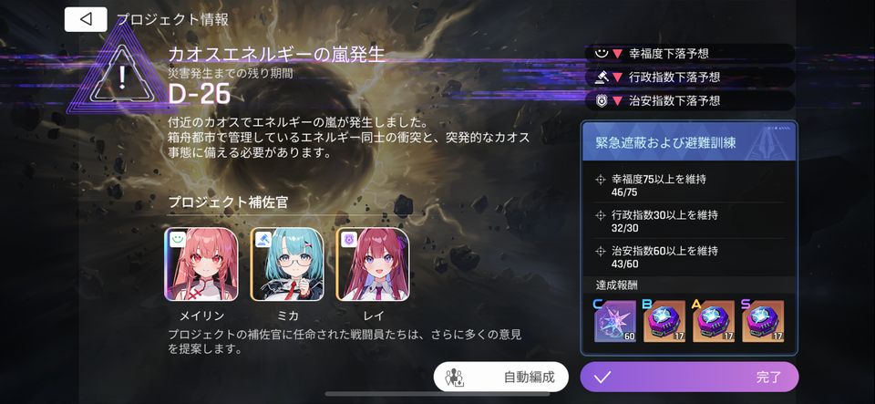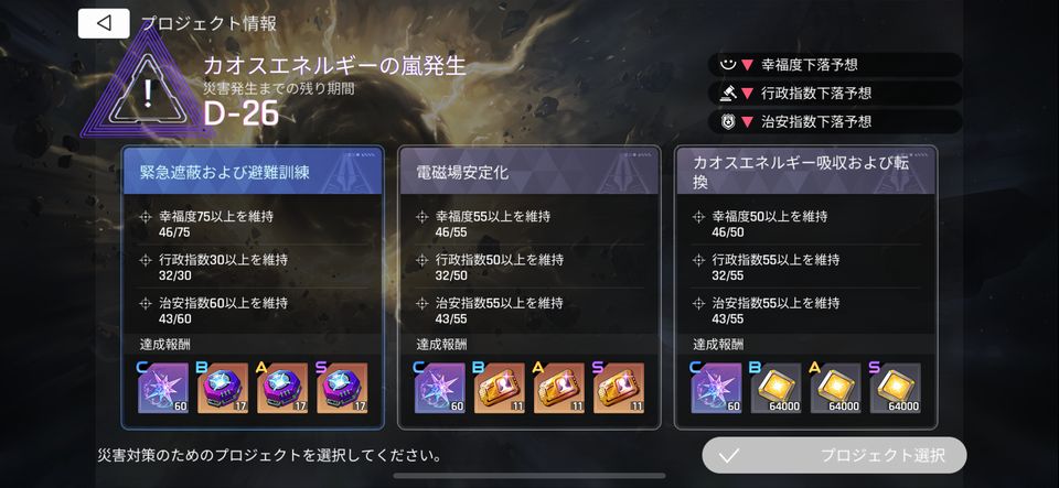 今回の「カオスエネルギーの嵐発生」は「幸福度」「行政指数」「治安指数」の3パラメータを強化(対策)しておくことで切り抜けることができる。