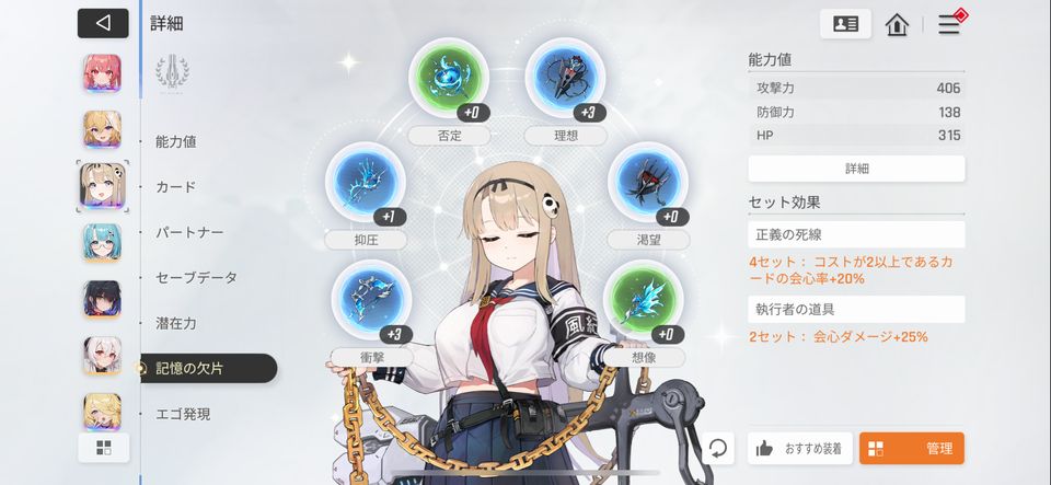 記憶の欠片周回は1回の消費スタミナ60と負担が大きいので、厳選にかかるのは他の育成が終わってからでいいと思う。