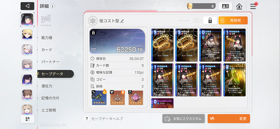 これはヒラメキでコスト1になった『時間軸破壊』が、コス1のくせに基礎ダメージ倍率300%+条件で更に倍率アップという、冷静に見たらイカれた高効率ダメージカードだと気付きで作ったデッキ。